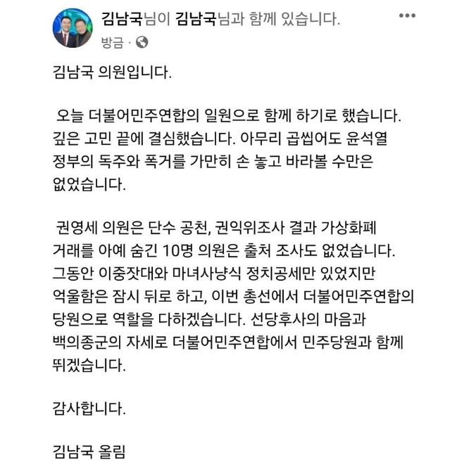 무소속 김남국 의원이 더불어민주당의 위성정당인 더불어민주연합에 입당한 사실이 확인되었습니다.