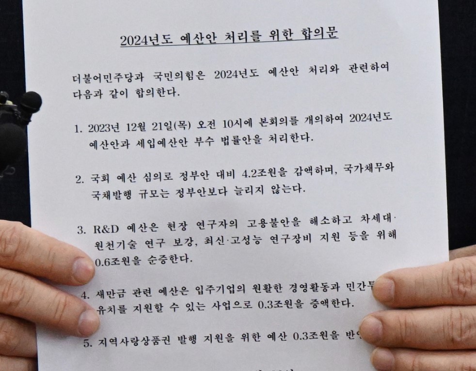 예산안 합의문에 따르면, 정부안보다 4조 2000억 원을 감액하고, 국가채무와 국채발행 규모는 정부안과 동일하게 유지하기로 결정했습니다. 연구개발(R&D) 예산은 6000억 원 증액하기로 합의되었고 이는 현장 연구자의 고용 안정성 강화, 차세대 원천기술 연구 강화, 고성능 연구장비 지원 등을 위해 필요합니다.
