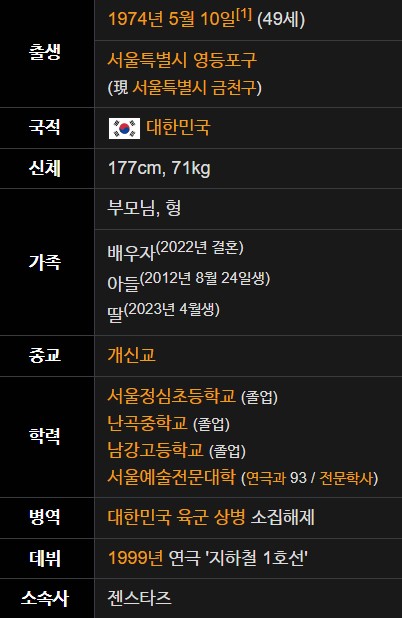 배우 임형준은 1974년 5월 10일 서울 금천구 출생으로 올해 50세입니다. 그의 키는 177cm, 몸무게 71kg입니다. 학력은 서울정심초등학교, 난곡중학교, 남강고등학교, 그리고 서울예술전문대학 연극과를 졸업하였으며 병역은 대한민국 육군 만기전역하였습니다. 가족으로는 부모님과 형 그리고 전처 사이에서 태어난 아들이 있습니다.  또한 22년도에 재혼한 배우자와 그리고 올해 태어난 늦둥이 딸이 있습니다.